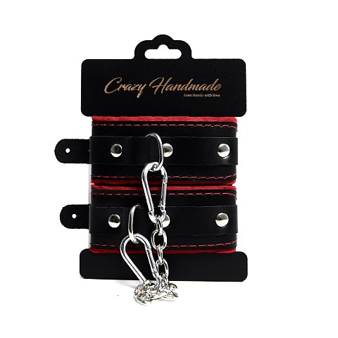 Наручники состоят из двух деталей: основа прямоугольной формы из натуральной кожи черного цвета и ремешок красного цвета с прочной хромированной фурнитурой в виде овального кольца. Расположение ремешка через прорези основной части является декоративным решением, а также служит для лучшей регулировки размера. В комплект входит соединительная цепочка с двумя карабинами.