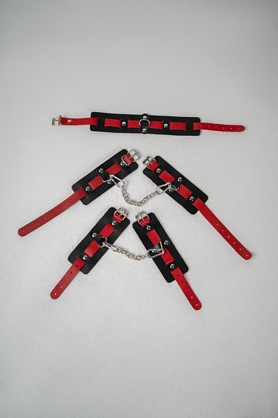 Ошейник состоит из двух элементов: основа прямоугольной формы из натуральной кожи черного цвета и ремешок красного цвета с прочной хромированной [~DETAIL_TEXT] => В набор входит ошейник, наручники и оковы.