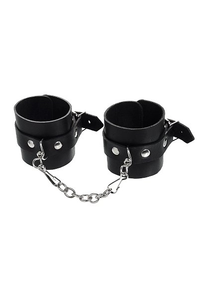 Оковы из натуральной кожи с декоративным элементом в виде двухслойного бантика черного цвета. В комплекте прочная соединительная цепочка с двумя карабинами. Длина чокера - 38 см.