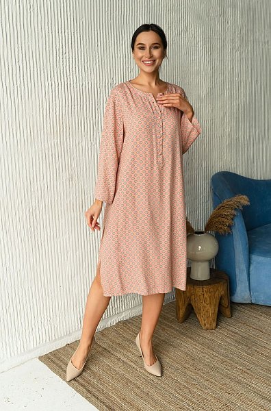 Длинная туника прямого силуэта с круглым вырезом горловины на полочке и спинке из принтованной вискозы. Модель с втачными широкими рукавами. Круглый вырез горловины полочки и спинки обработан притачной фигурной обтачкой. V-образный разрез на горловине полочки обработан притачной планкой. Планка туники застегивается на петли и обтяжные пуговицы из основной ткани.