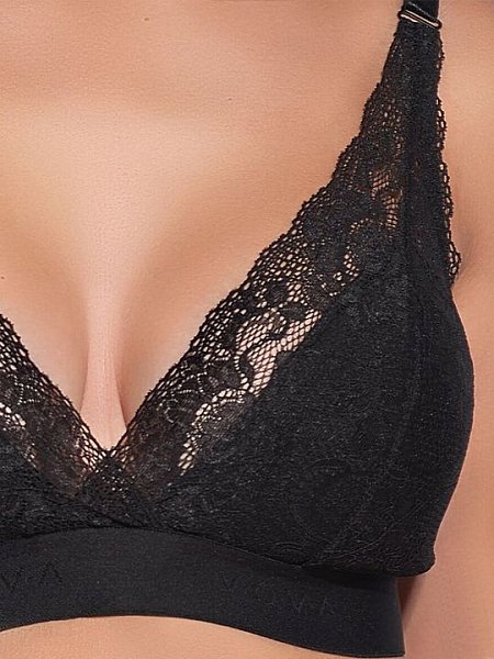 Легкий бескаркасный бюстгальтер полуспортивного типа. Стан из полотна в виде широкого пояса с логотипом VOVA пришита на плоскошовной машине. Чашки состоят из двух поролоновых деталей, которые продублированы кружевными деталями. Низкая серединка. Обеспечивает округлую форму и красивое расположение груди. Регулируемые бретели. Выполнен из мягкого нежного кружева и микрофибры.
