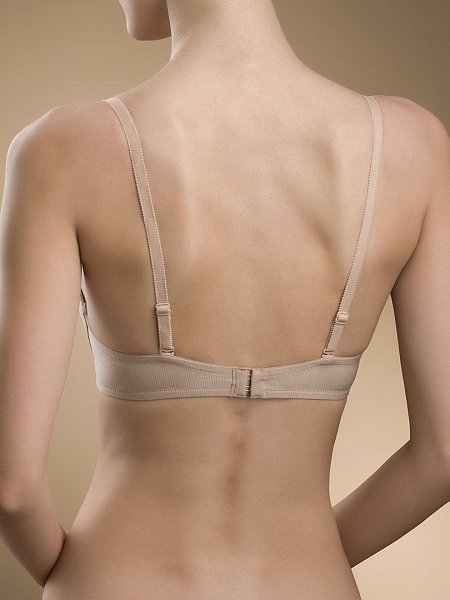 Бюстгальтер пуш-ап, на каркасах, из тонкого эластичного полотна в полоску. Интегрированный в чашку вкладыш придает дополнительный объем. Узкая центральная деталь визуально облегчает образ. Отстегивающиеся на спинке бретели с возможностью застегивать крест-накрест для одежды с открытыми плечами.