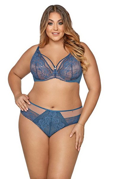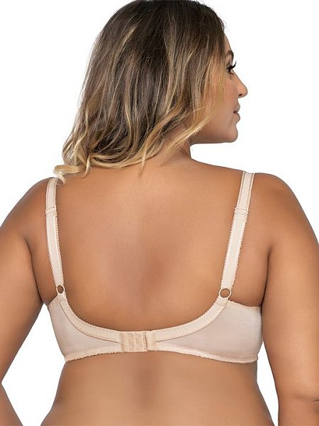 Бюстгальтер выполнен на косточках, чашки мягкие, шитые из сетки и кружева, не сшитыми между собой, спинка гладкая, бретельки не отстёгиваются, регулируются по длине. На спине застёжка на удлинитель, количество крючков в ряду застёжки увеличивается пропорционально размеру бюстгальтера.