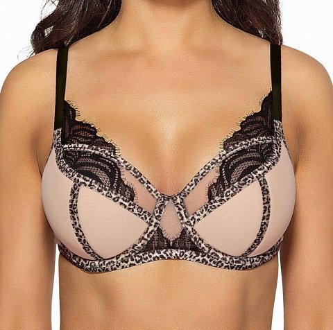 Бюстгальтер-полупоролон со сшивной чашкой. Эффектная отделка кружевом и леопардовым кантом.